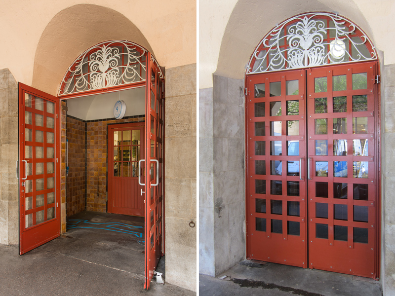 In die unter der alten Konstruktion noch vorhandenen bauzeitlichen Türrahmen wurde eine neue, handwerklich gebaute Stahltüre eingesetzt. Die kreuzförmige Bänderung wurde als „gewebte“ Flachstahlsprossen vor dem gewünschten Glasfeld aufgenommen. Die erhaltenen Oberlichter mit ihren Ornamentgittern wurden repariert. Die Farbgestaltung stellt die Verbindung zu den sanierten Bestandstüren her.