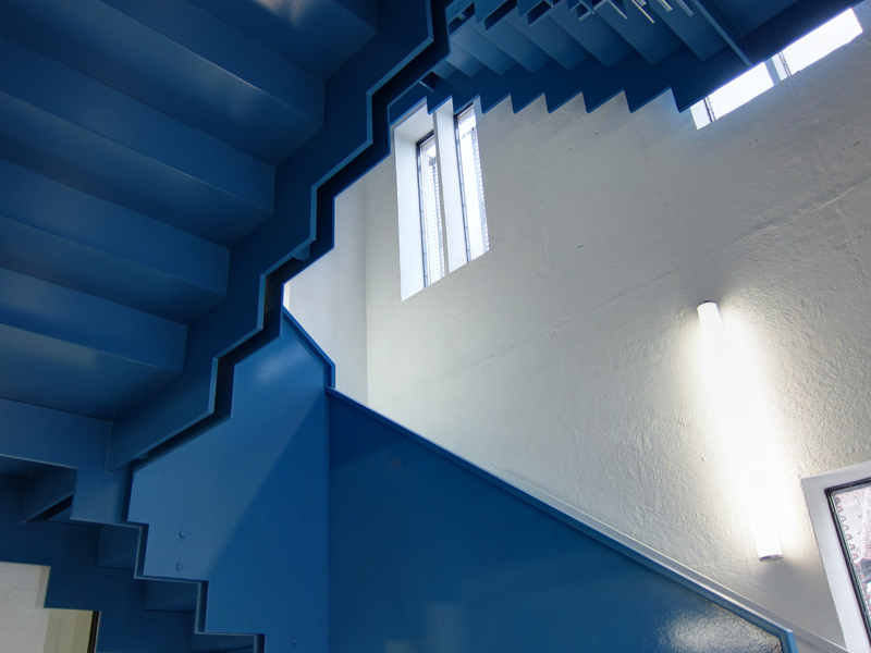Das zurückhaltende Farbkonzept konzentriert sich auf ein Veronesergrün der Fensterrahmen und ein damit korrespondierendes Blau. Dieses betont die Treppenkonstruktion und die Stelen vor wichtigen Nutzungen. Zudem gibt es noch ein ganz lichtes Grün auf den Türen, „Malachit“ genannt. Sonst strahlt fast alles in klarem Kalkweiß, das den Raum vergrößert. Das Leitsystem der Grafikerin Caroline Pöll nimmt das Thema Streckmetall grafisch auf und fasst alle Informationen übersichtlich zusammen. Außen wirkt der reine Kalkputz mit etwas hellem Ocker und Zuschlägen aus schwarzem Marmorsplitt edel.